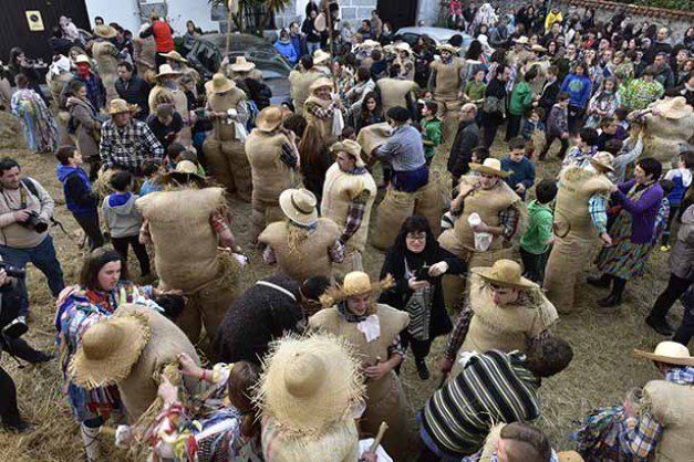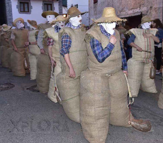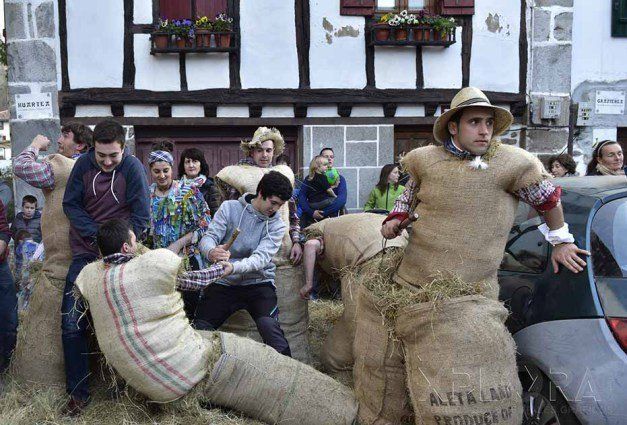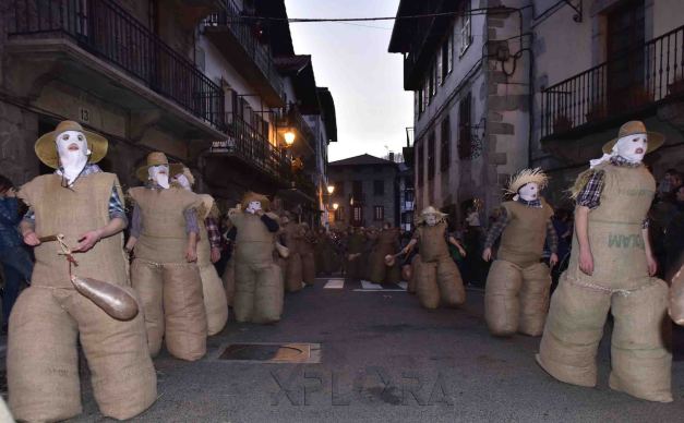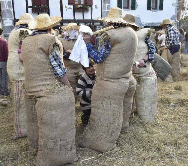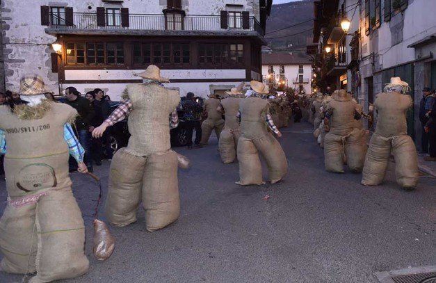El domingo al atardecer, la comitiva de hombres con la cara cubierta y vestidos con sacos de paja recorre las calles persiguiendo a la gente con vejigas infladas. “Mairuak” (mujeres vestidas con cintas) y “Goitarrak” (hombres y mujeres vestidos de blanco con cascabeles, con jersey y txapela roja tocando las castañuelas) amenizan las calles.