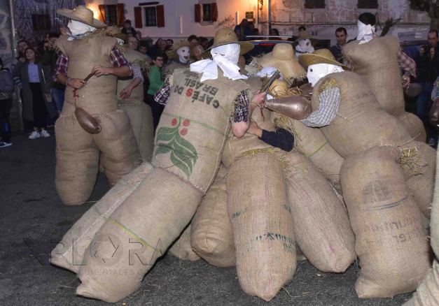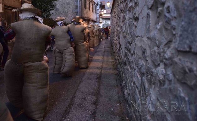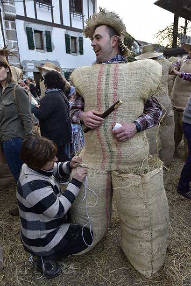 Inicialmente, los muchachos rellenaban los sacos con helecho seco, en contacto directo con el cuerpo. La música de la Banda de Música de Lesaka les acompaña animando el recorrido tradicional que acaba en la plaza. Ahí, agarrados a unas anillas de hierro de la pared, para que no se caigan, se dejarán quitar el “singular traje”.