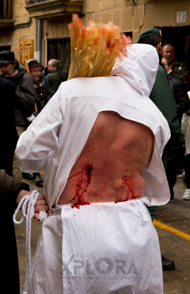 Después, reza una oración y acto seguido se pone de pie para que su acompañante le retire la capa de los hombros. Es en ese momento cuando puede comenzar a golpearse con la madeja. Más o menos, está unos 20 minutos flagelándose (se dan entre 800 y 1000 golpes) para que a continuación la persona que le acompaña y el práctico decidan cuándo es el momento de pincharle.